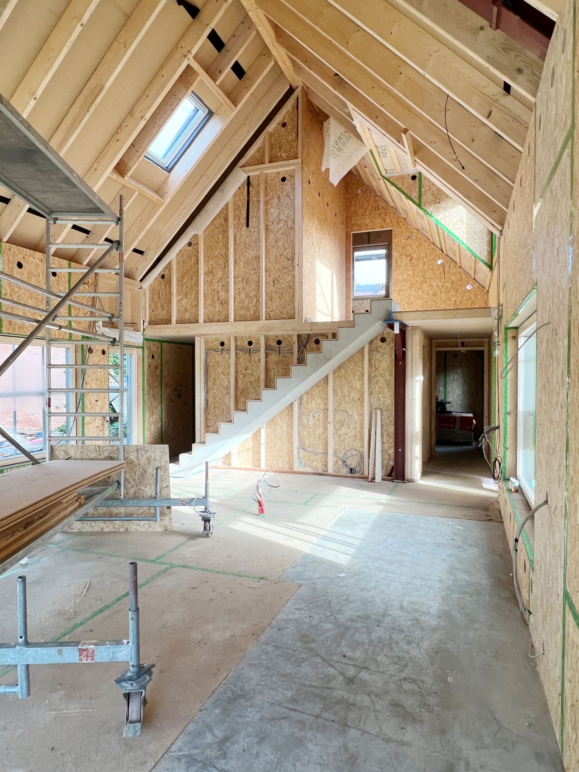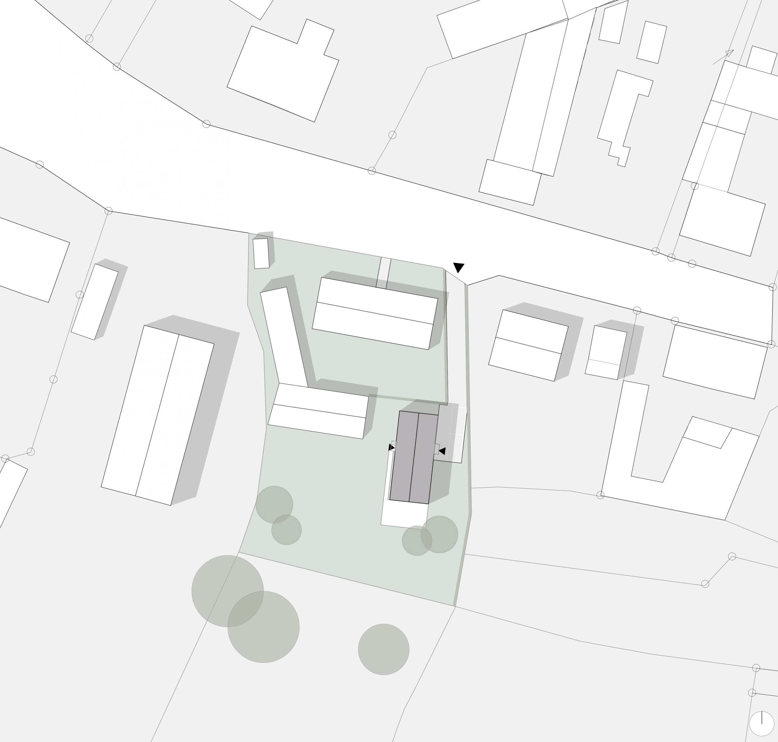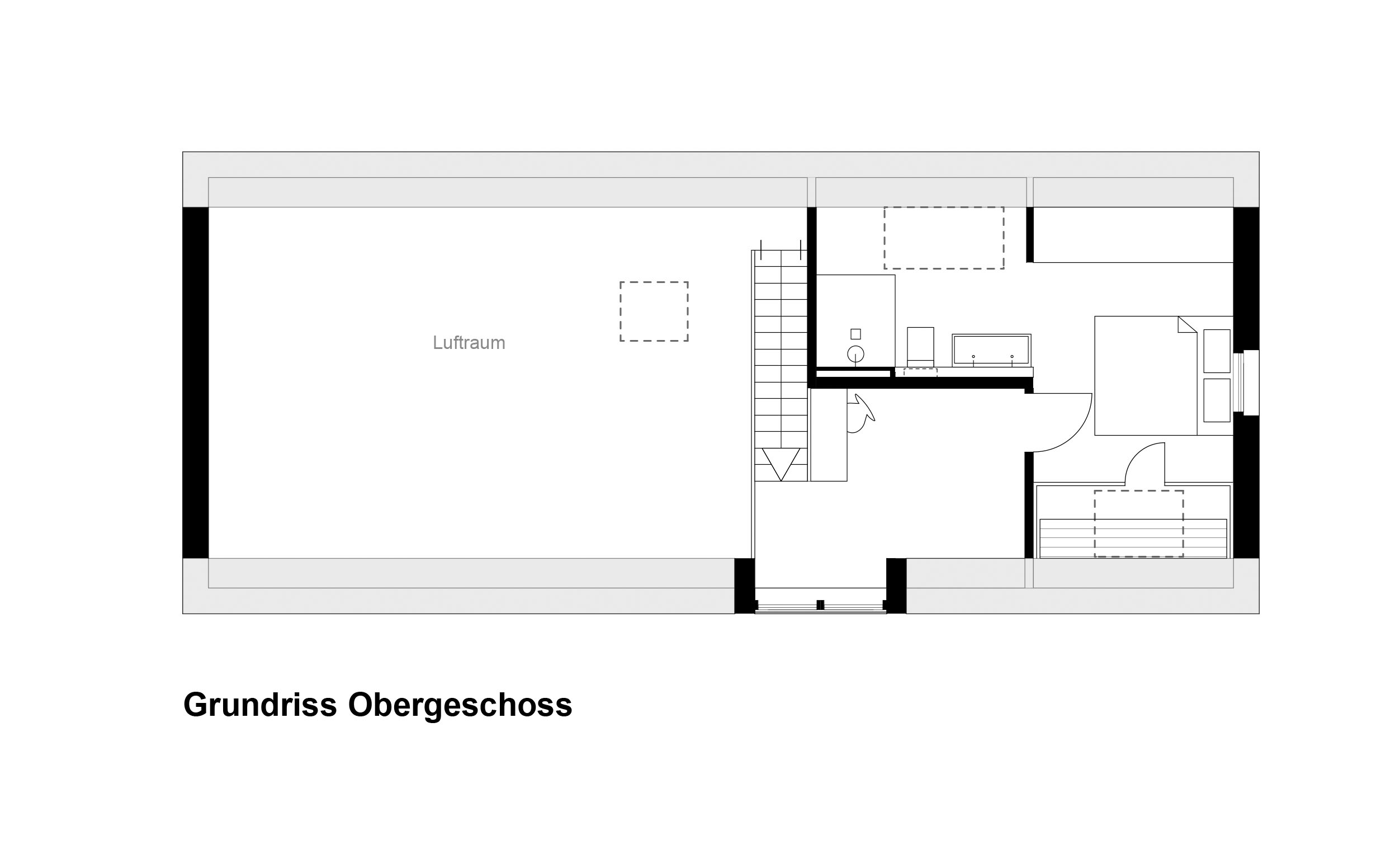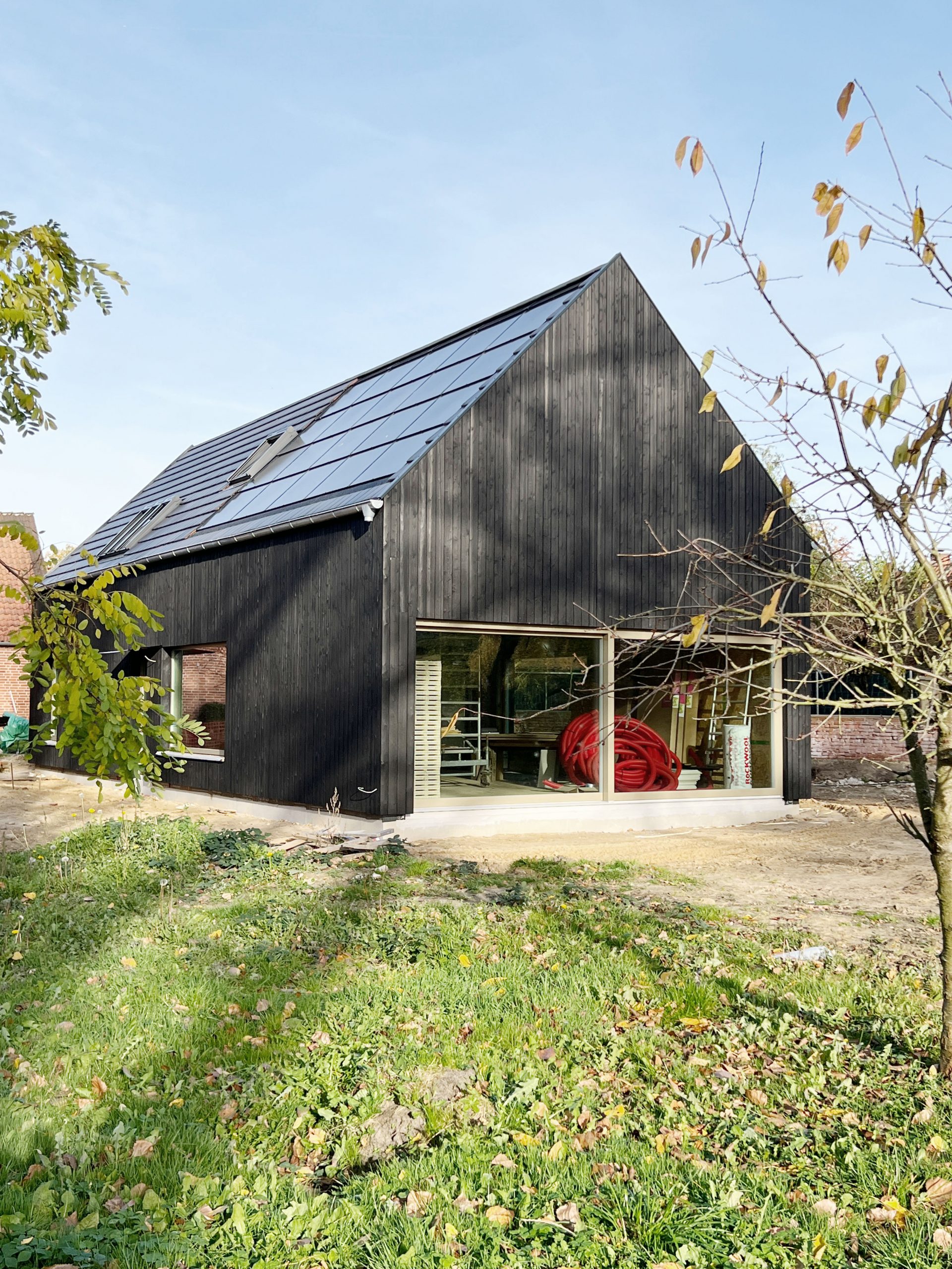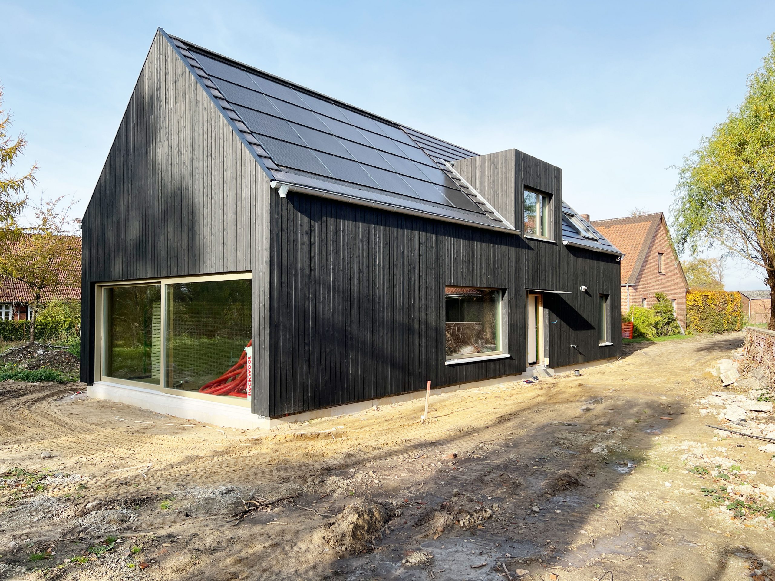 Das Gebäude wurde auf dem alten Standort des in den 1950’er Jahren abgebrannten Kuhstalls errichtet. So bilden die Bestandsgebäude und der Neubau wieder ein Ensemble, das an die alte landwirtschaftliche Nutzung als Hofstruktur erinnert. Das Gebäude ist in Holzrahmenbauweise mit natürlicher Cellulose Dämmung und Holzfaserdämmplatten erstellt. Die dunkle Gebäudehülle aus verkohlten Lärcheholz steht im starken Kontrast mit dem hellen und fein strukturierten Materialien im Innenraum. In der tragenden Stahlbetonsohle ist die Fussbodenheizung sowie die Lüftungsleitungen integriert. Die kompakten Schlafräume stehen wiederum im Kontrast zu dem großzügigen, über zwei Geschosse hohen Wohn/Ess und Kochbereich. Die Galerie lockert den Innenraum auf, es entstehen Blickbeziehungen und Rückzugsorte. Die große Glasfront nach Süden ermöglicht einen unverbauten Blick über die Koppeln, Felder und Allee, sowie Wälder in der Ferne.